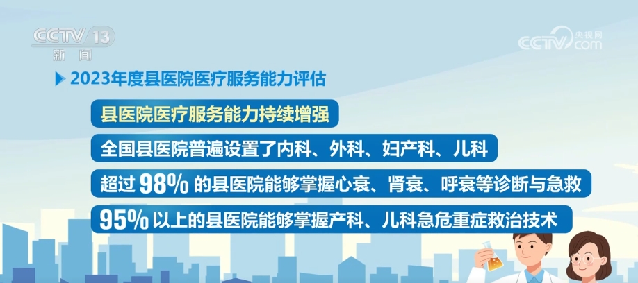 央視網消息:國家衛生健康委29日通報了2023年度縣醫院醫療服務能力評估情況,全國共有2062家縣醫院參與(yu) 醫療服務能力第三方評估,縣域覆蓋率達到98.6%。評估顯示,全國有91.85%的縣醫院符合基本標準,也就是相當於(yu) 達到二級醫院能力,其中符合推薦標準達到三級醫院能力的占比超過一半。