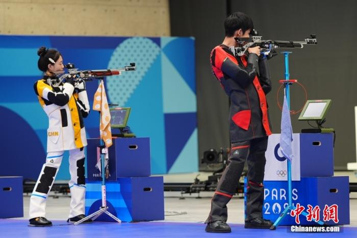 當地時間7月27日,在法國沙托魯舉(ju) 行的巴黎奧運會(hui) 射擊10米氣步槍混合團體(ti) 決(jue) 賽中,中國組合黃雨婷/盛李豪奪得金牌。圖為(wei) 黃雨婷(左)/盛李豪在比賽中。中新社記者 趙文宇 攝