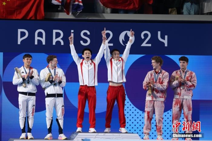 當地時間7月29日,在巴黎奧運會(hui) 跳水男子雙人十米台決(jue) 賽中,中國選手練俊傑/楊昊奪得金牌。圖為(wei) 頒獎儀(yi) 式。中新社記者 富田 攝
