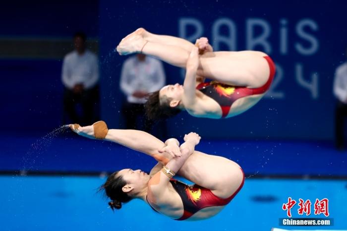 當地時間7月27日,中國組合昌雅妮(下)/陳藝文在比賽中。當日,在巴黎奧運會(hui) 跳水女子雙人3米板決(jue) 賽中,中國組合昌雅妮/陳藝文奪得金牌。 中新社記者 富田 攝
