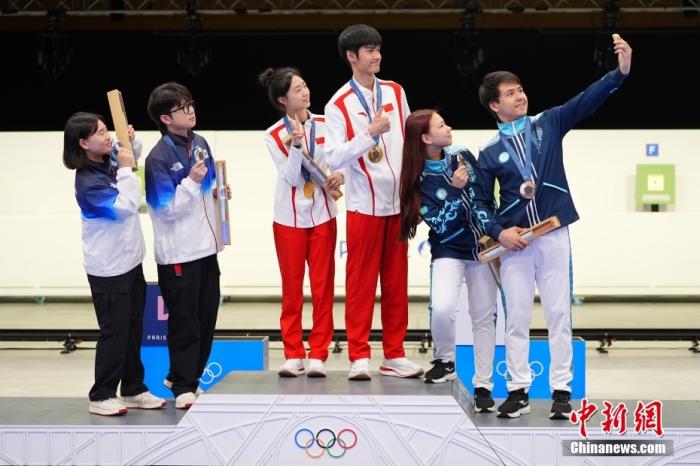 當地時間7月27日,在法國沙托魯舉(ju) 行的巴黎奧運會(hui) 射擊10米氣步槍混合團體(ti) 決(jue) 賽中,中國組合黃雨婷/盛李豪奪得金牌。這也是本屆巴黎奧運會(hui) 誕生的首枚金牌。圖為(wei) 獲獎選手在頒獎儀(yi) 式上自拍。中新社記者 趙文宇 攝