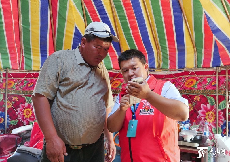 工作人員給牧民木拉提·畢木拉介紹用手機連接“智慧項圈”後的使用方法。周偉(wei) 傑 攝