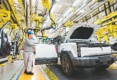 今年上半年,安徽省蕪湖市出口電動載人汽車數量1.49萬(wan) 輛,同比增長144.3%。圖為(wei) 在蕪湖市奇瑞新能源愛咖生態科技有限公司新能源汽車生產(chan) 車間,工人在進行組裝生產(chan) 作業(ye) 。