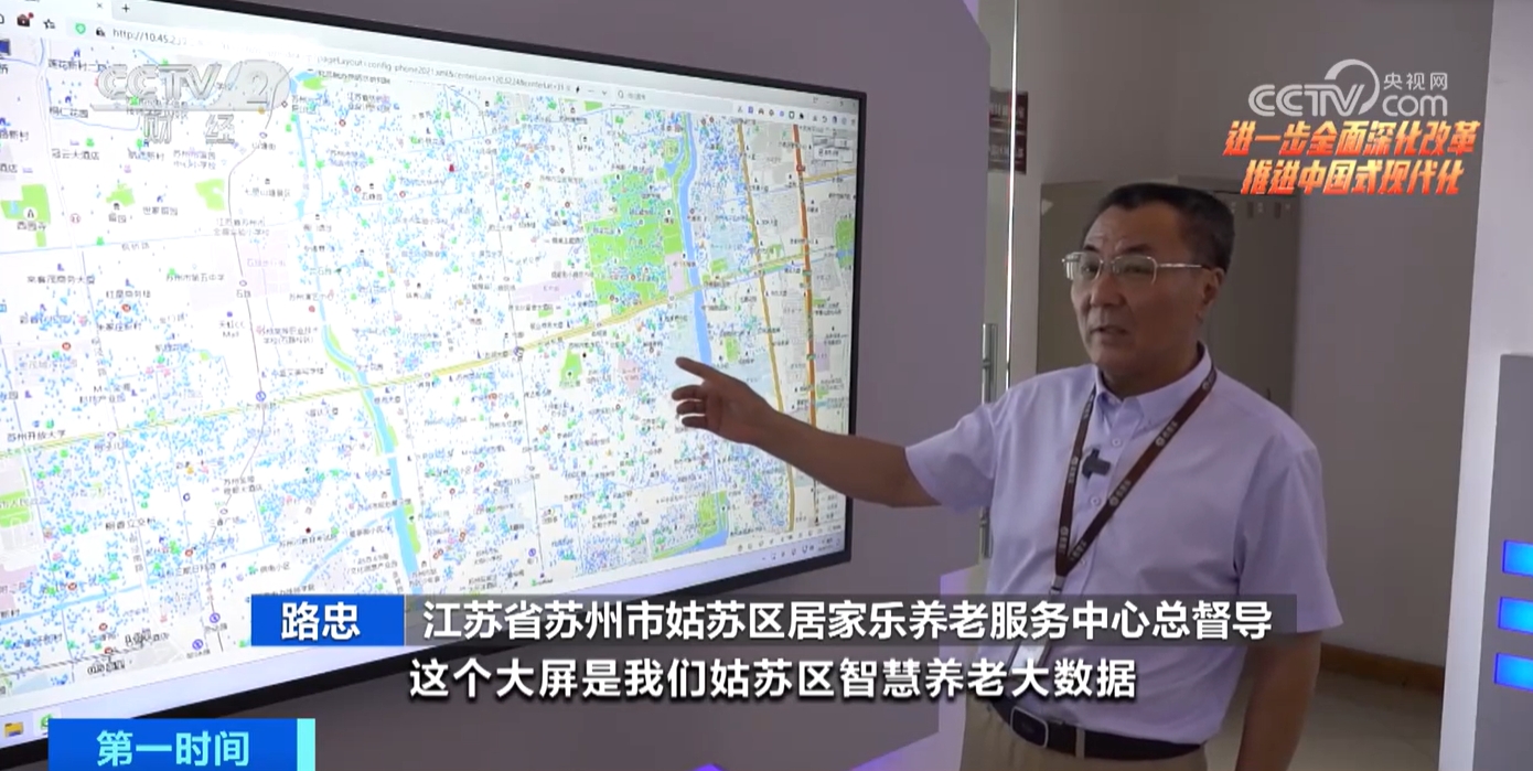 江蘇蘇州姑蘇區居家樂(le) 養(yang) 老服務中心總督導路忠介紹,這個(ge) 大屏是姑蘇區智慧養(yang) 老大數據在線實時的數字地圖,粉色的點就是現在正在服務中的284戶老人,綠色的點位就是現在還有900多個(ge) 老人在等待著上門服務,大量的藍色的小點是服務用戶,是整個(ge) “虛擬養(yang) 老院”的老人。