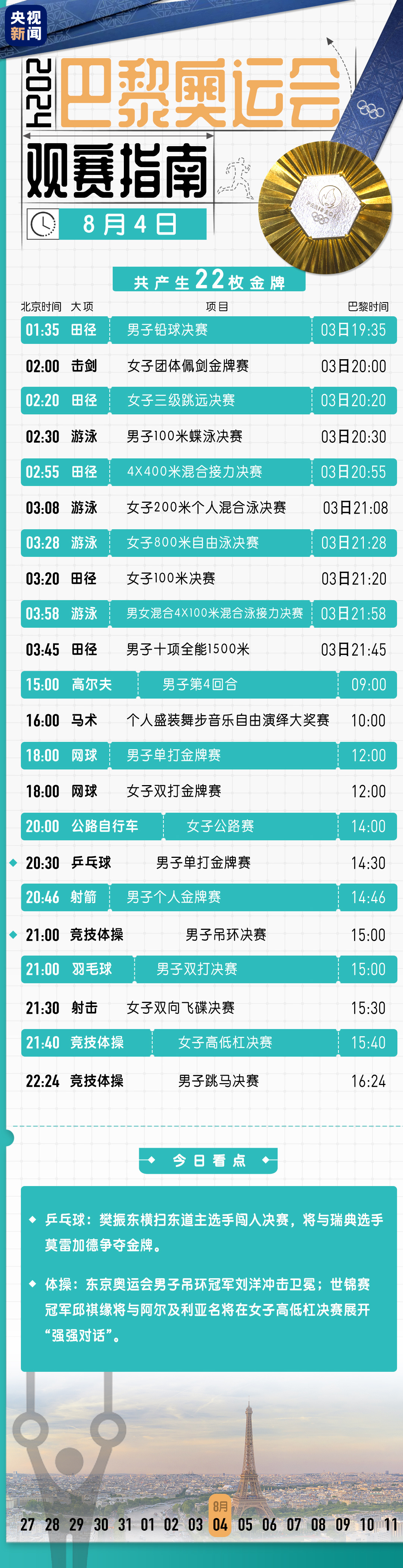 巴黎奧運會(hui) 第九個(ge) 比賽日將產(chan) 生20枚金牌。中國體(ti) 育代表團將在乒乓球、羽毛球等項目上衝(chong) 擊金牌。
