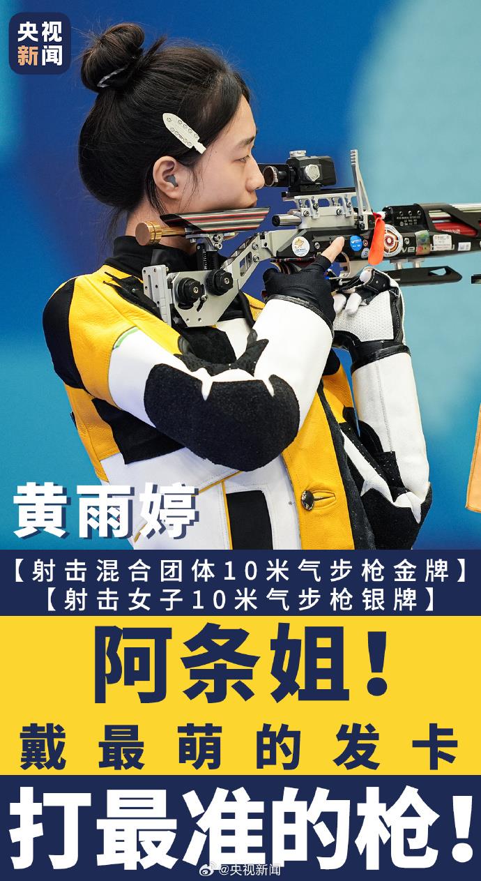 7月29日,在射擊女子10米氣步槍決(jue) 賽中,“阿條姐”黃雨婷以0.1環之差獲得銀牌。