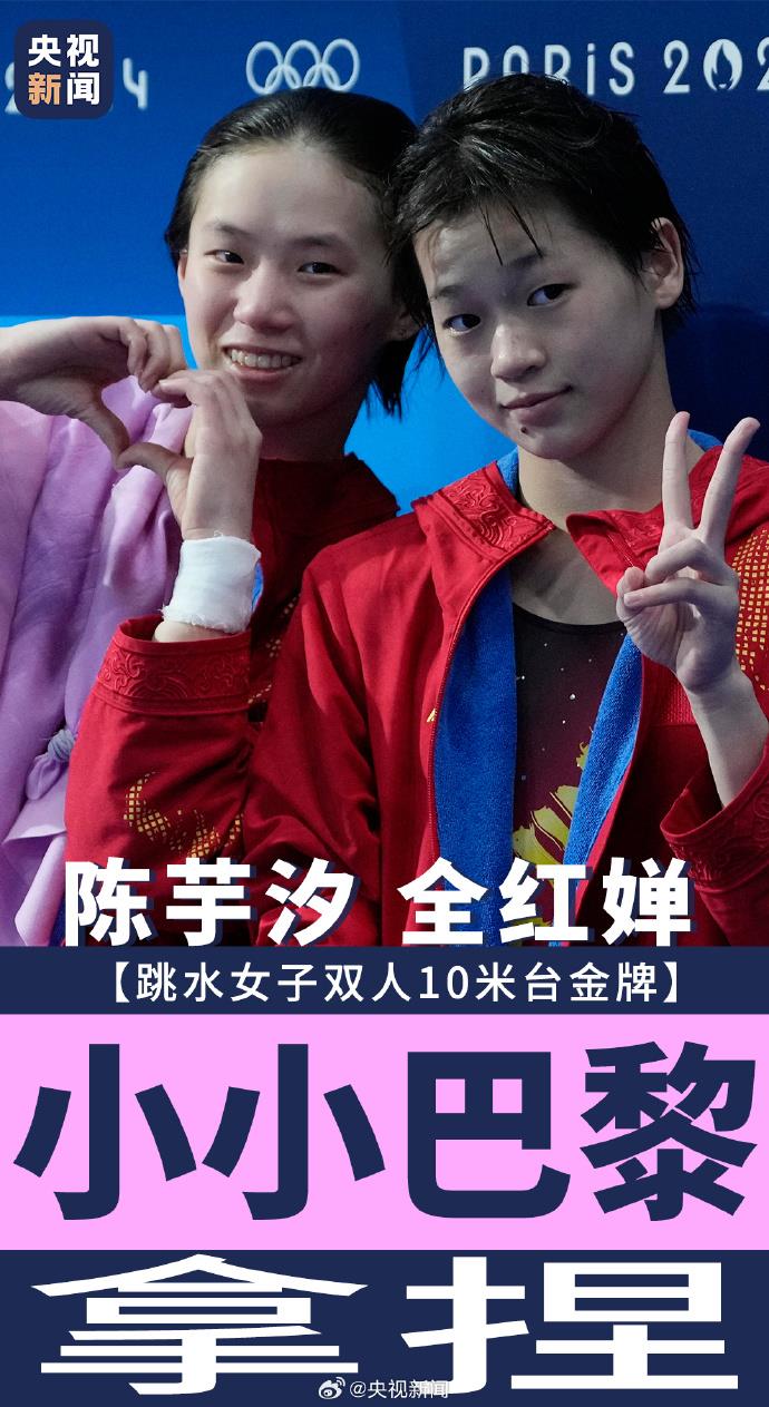 賽後,全紅嬋掛在陳芋汐身上退場時,複刻經典慶祝動作:“小小巴黎,拿捏!”