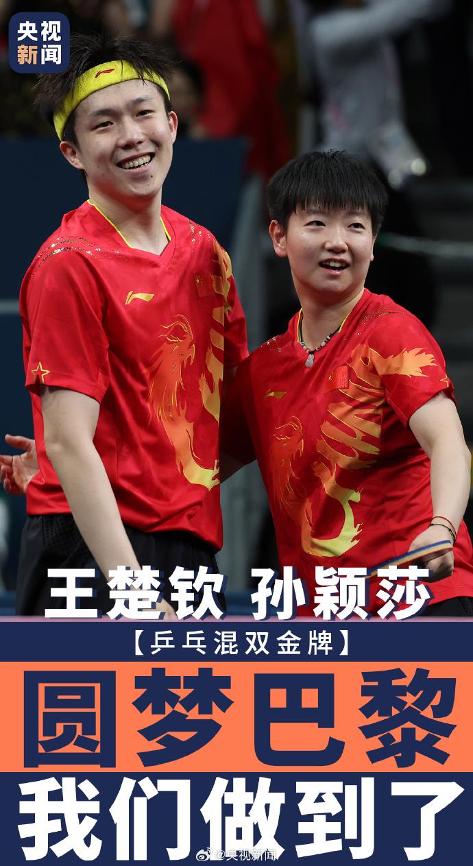 7月30日,在巴黎奧運會(hui) 乒乓球混合雙打決(jue) 賽中,中國組合王楚欽/孫穎莎4-2戰勝朝鮮組合,奪得金牌。“我們(men) 做到了!”東(dong) 京的遺憾在巴黎畫上了一個(ge) 圓滿的句號!