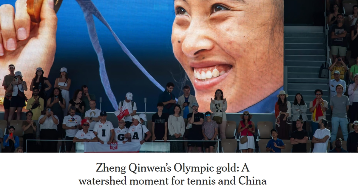 據美國《紐約時報》(NYTimes)當地時間4日在對中國網球選手鄭欽文的專(zhuan) 題報道中寫(xie) 道,對於(yu) 中國網球來說,這隻是一個(ge) 時間問題,不是嗎?當天淩晨,21歲的鄭欽文奪得巴黎奧運會(hui) 女子網球單打冠軍(jun) ,為(wei) 中國網球奪得了首枚奧運女單金牌。