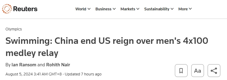 當地時間8月4日,在遊泳男子4×100米混合泳接力中,中國隊反超該項目的奧運“霸主”美國隊以及東(dong) 道主法國隊,以3分27秒46奪冠。英國路透社(Reuters)4日的報道中寫(xie) 道,現場歡呼聲震耳欲聾,中國隊的奪冠結束了美國隊64年來的不敗紀錄。賽後,美國選手萊恩·墨菲(Ryan Murphy)說:“今天中國隊的表現比我們(men) 要更好一些,向中國隊致敬,他們(men) 今晚的表現非常出色。”另一名美國選手亨特·阿姆斯特朗(Hunter Armstrong)則關(guan) 注到當天是中國選手潘展樂(le) 的生日,他表示:“這對他來說會(hui) 是一份很酷的生日禮物!”
