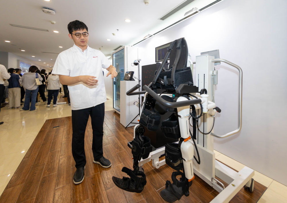 2024年5月24日,在位於(yu) 上海市嘉定區的上海交通大學醫學院附屬瑞金醫院腫瘤質子中心,工作人員介紹由瑞金醫院醫生和醫療公司共同研發的用於(yu) 恢複患者下肢的醫療機器人。新華社記者 王翔 攝