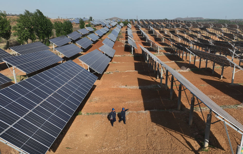 2024年4月16日,工人在河北省石家莊市靈壽縣譚莊鄉(xiang) 程家莊村的“農(nong) 光互補”光伏發電場巡查(無人機照片)。新華社記者 楊世堯 攝