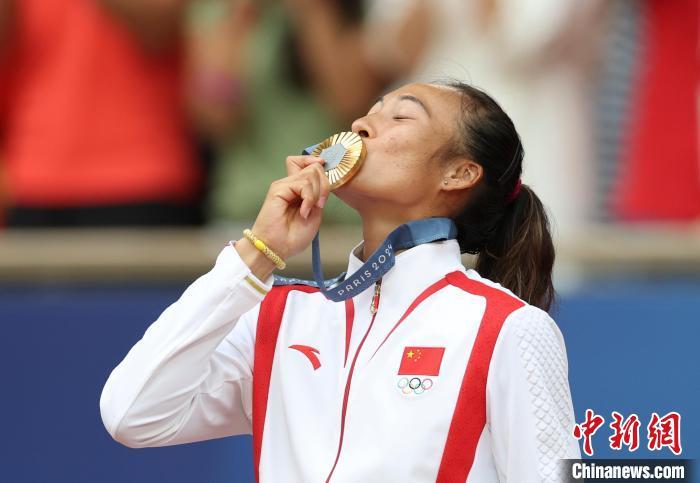 當地時間8月3日,在巴黎奧運會(hui) 網球女子單打比賽中,中國選手鄭欽文以2:0勝克羅地亞(ya) 選手維基奇,獲得金牌。圖為(wei) 鄭欽文親(qin) 吻金牌。中新社記者富田攝
