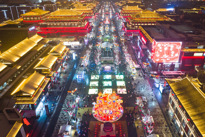 西安大唐不夜城景區景色(2024年2月2日攝,無人機照片)。新華社記者 邵瑞 攝