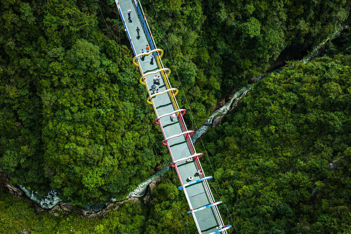 2023年8月20日,遊客在湖北省恩施州建始縣地心穀景區遊玩(無人機照片)。新華社記者 肖藝九 攝
