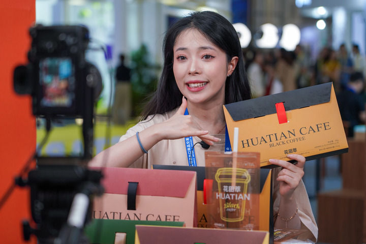 2024年7月24日,參展商在南博會(hui) 咖啡產(chan) 業(ye) 館直播帶貨。新華社記者 王靜頤 攝