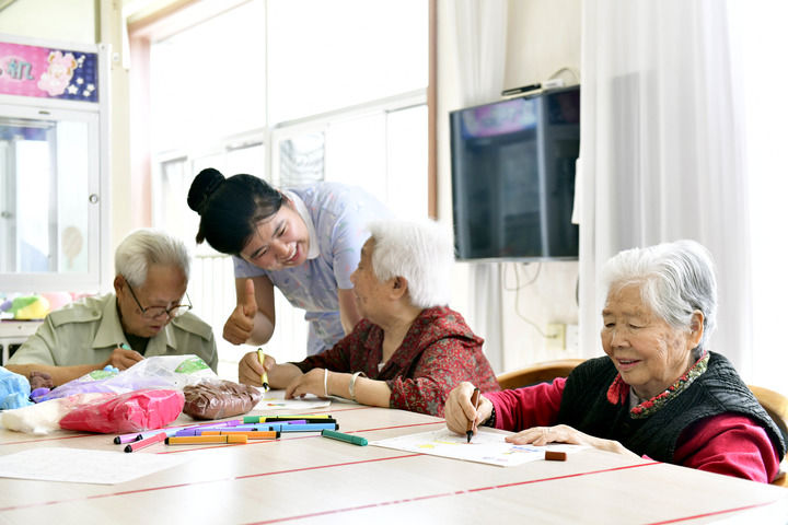 2024年5月25日,在山東(dong) 省日照市東(dong) 港區石臼街道日照幸福護理院,老人在工作人員的陪護下做填圖遊戲。新華社記者 郭緒雷 攝