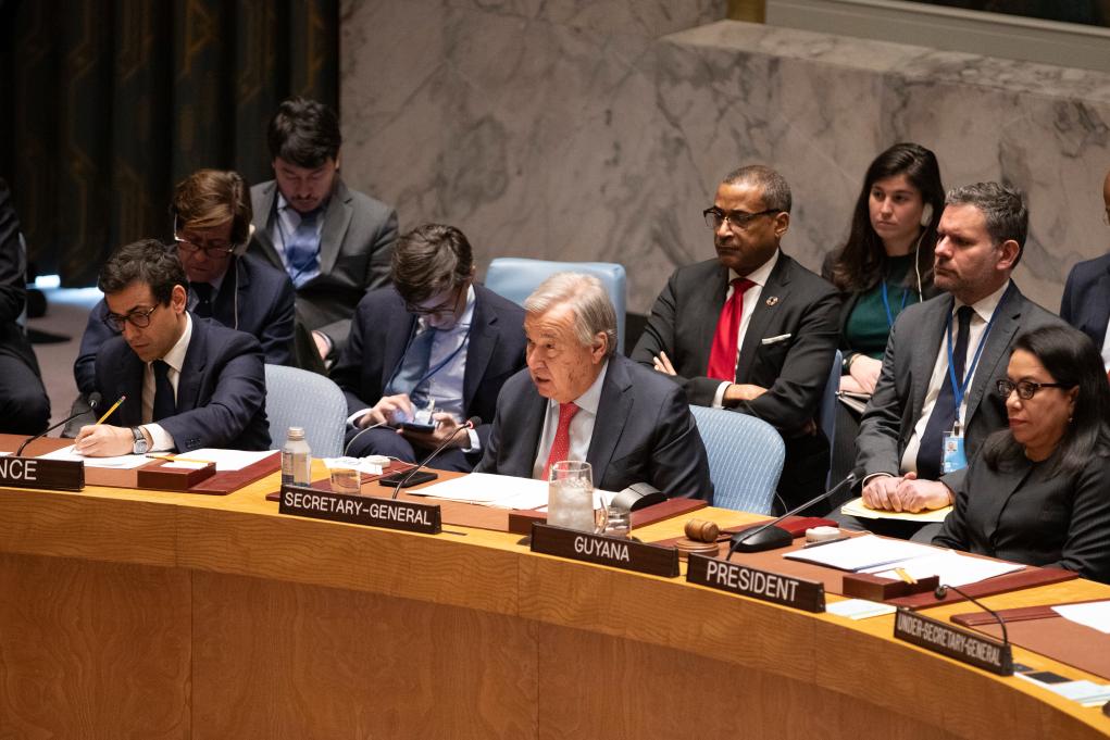 2月23日,在位於(yu) 紐約的聯合國總部,聯合國秘書(shu) 長古特雷斯(前排中)在烏(wu) 克蘭(lan) 問題高級別公開會(hui) 上發言。烏(wu) 克蘭(lan) 危機升級兩(liang) 周年之際,聯合國安理會(hui) 23日舉(ju) 行烏(wu) 克蘭(lan) 問題高級別公開會(hui) ,與(yu) 會(hui) 多方呼籲通過政治手段解決(jue) 烏(wu) 克蘭(lan) 危機。新華社記者謝鍔攝