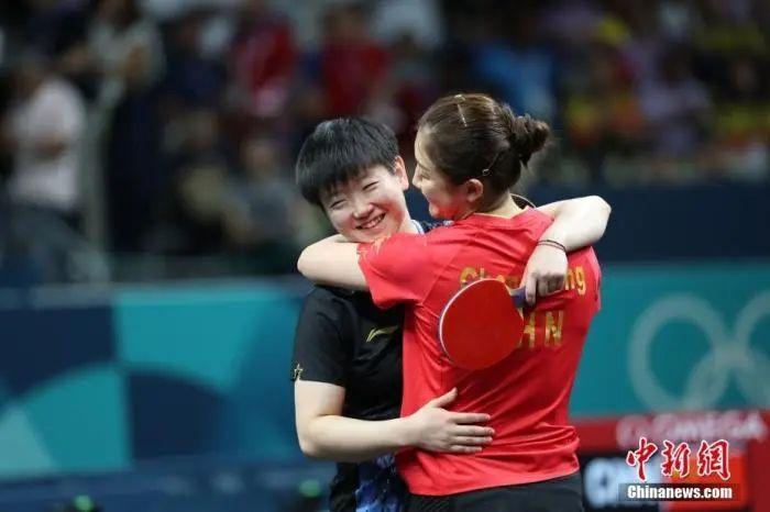 資料圖:巴黎奧運女單決(jue) 賽後,陳夢擁抱孫穎莎。中新社記者 盛佳鵬 攝