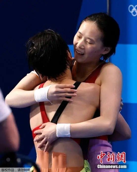 奪冠後的全紅嬋撲進教練陳若琳懷裏,隨後又一路小跑奔向陳芋汐。在全世界的矚目下,兩(liang) 位天才少女緊緊擁抱在一起。