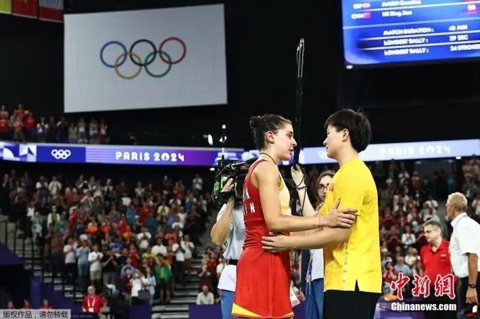 資料圖:當地時間8月4日進行的巴黎奧運會(hui) 羽毛球女單半決(jue) 賽中,西班牙名將馬林在比賽進行到第二局時因傷(shang) 棄權,中國選手何冰嬌晉級女單決(jue) 賽。圖為(wei) 何冰嬌前去與(yu) 馬林表示安慰。