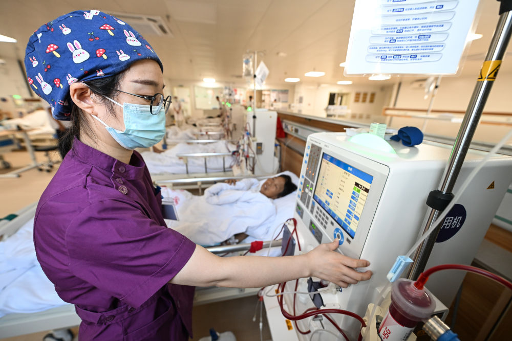 江蘇海安市曲塘中心衛生院護士在血液透析中心操作設備(2024年7月31日攝)。海安加快優(you) 質醫療資源下沉,對基層醫療機構管理、技術等方麵進行幫扶。數據顯示,2023年海安市縣域內(nei) 就診率為(wei) 90.54%,基層醫療衛生機構門急診占比為(wei) 74.86%。新華社記者 季春鵬 攝