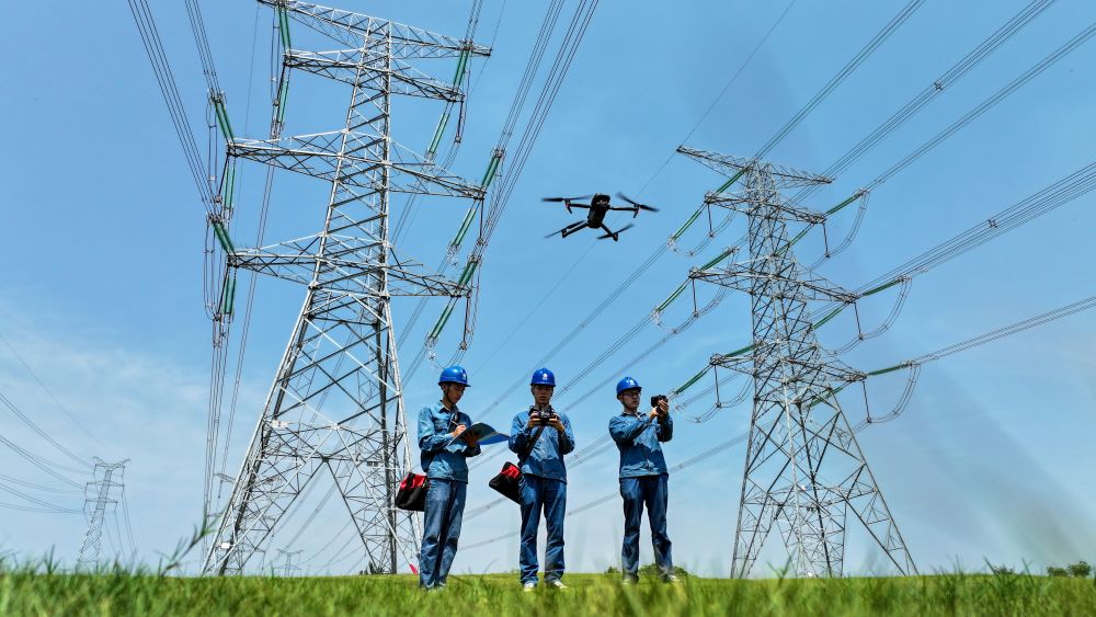 麵對安徽、江蘇持續高溫,皖蘇兩(liang) 省的電力工人聯合對省際聯絡線及相關(guan) 配電設施進行檢修,並開展輸變電設施巡視檢查。這是在安徽省滁州市南譙區,電力工人運用無人機對500千伏輸電線路進行巡視檢查(2024年8月9日攝)。新華社記者 曹力 攝