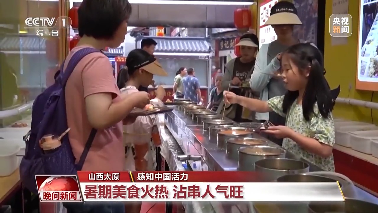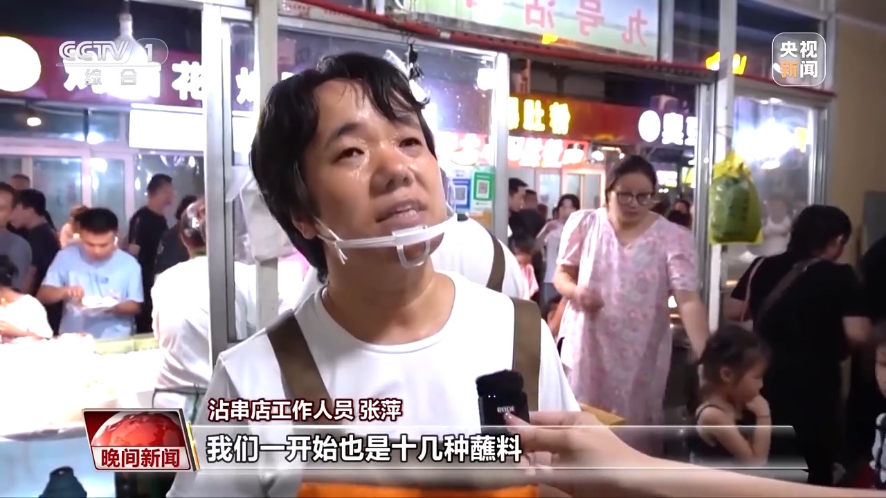 夜幕降臨(lin) 、高溫消散,山西太原食品街就迎來大批食客。食品街的一家沾串店麵積不大,食客隻能站著吃,但卻吸引大批食客光顧。沾串食材是熟的,食客蘸上各個(ge) 口味的醬料就能直接開吃。