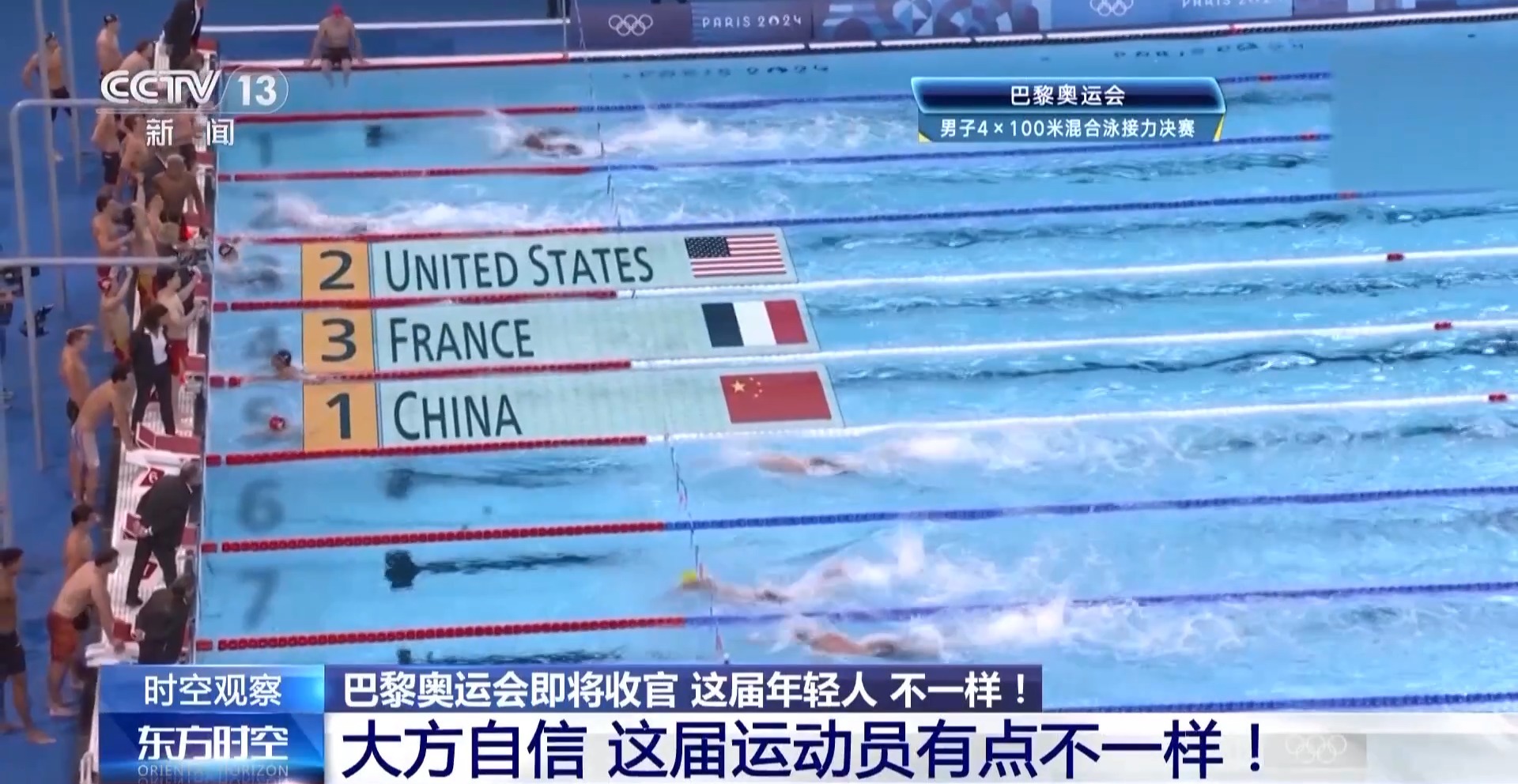 巴黎奧運會(hui) 遊泳賽場最後一個(ge) 比賽日,中國隊放了個(ge) 大招。男子4X100米混合泳接力決(jue) 賽上,中國隊力壓該項目40年“霸主”美國隊,以3分27秒46的成績奪冠。