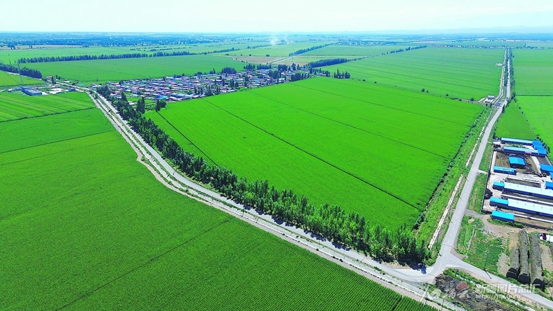 俯瞰博樂(le) 市小營盤鎮呼和布熱村一角(8月8日無人機攝)。放眼該村,平坦的農(nong) 村公路、綠色的條田、整齊的村莊,形成一幅美麗(li) 的鄉(xiang) 村畫卷。 賀程攝