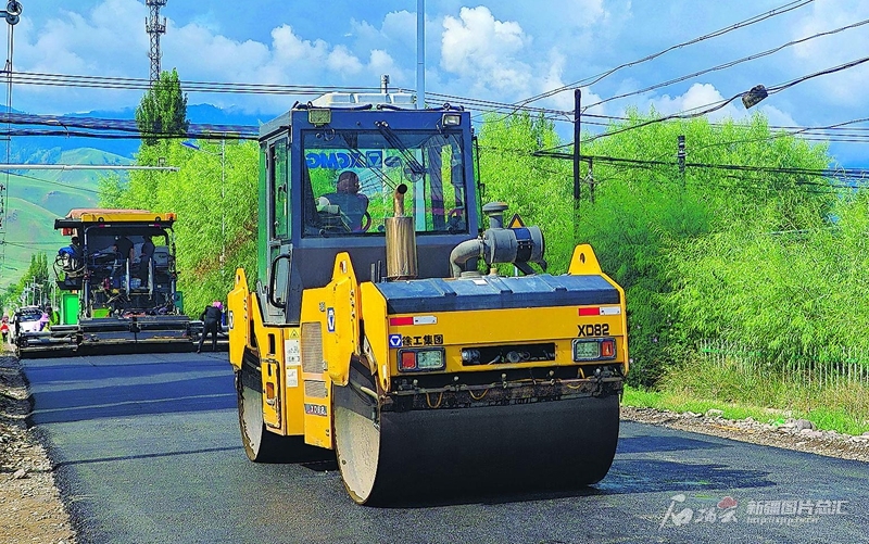 7月29日,工人在通往新源縣坎蘇鎮闊克托別村的農(nong) 村公路建設現場攤鋪瀝青。今年,新源縣實施農(nong) 村公路建設項目5個(ge) ,建設裏程94.845公裏,涉及4個(ge) 鄉(xiang) 鎮,目前已完成工程量的75%。 張文庭攝