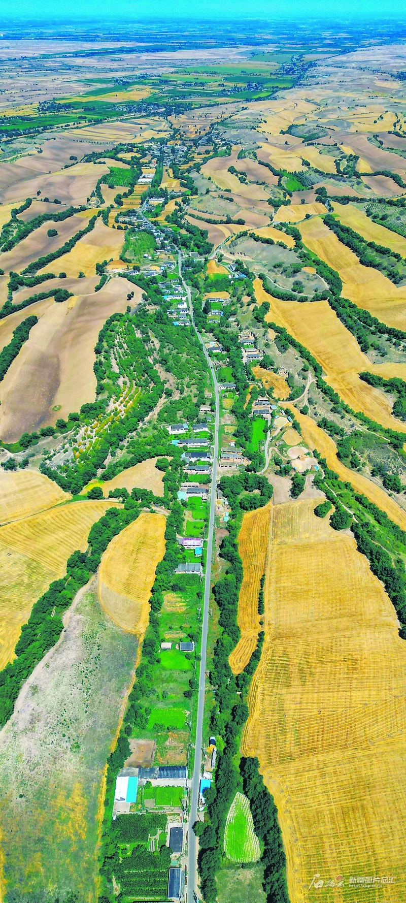 俯瞰木壘哈薩克自治縣英格堡鄉(xiang) 廟爾溝村(8月2日無人機攝)。通過廟爾溝村的鄉(xiang) 道串聯著戶戶農(nong) 家,也串聯出鄉(xiang) 村振興(xing) 新圖景。 石榴雲(yun) /新疆日報記者蔡增樂(le) 攝
