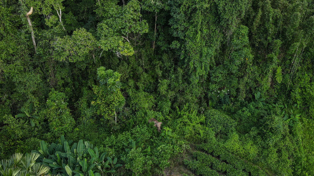 在雲(yun) 南西雙版納國家級自然保護區猛養(yang) 片區邊緣活動的亞(ya) 洲象阿寶(7月26日無人機照片)。(許團明 攝)