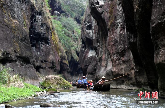 遊客乘坐竹排在上清溪景區遊玩。記者 呂明 攝
