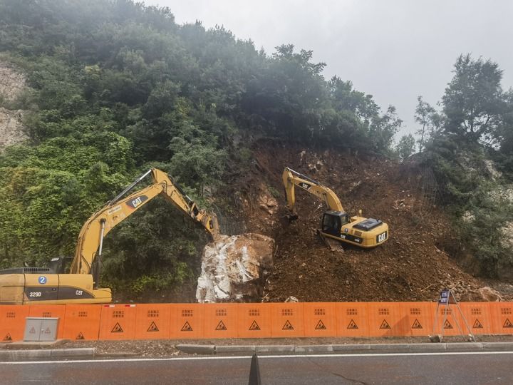 8月6日,大型機械設備在清理位於(yu) 吉林省集安市下解放村一處山坡上的“落石”。新華社發