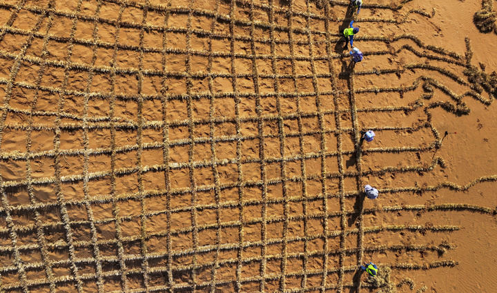 治沙工人在寧夏中衛市境內(nei) 的騰格裏沙漠鋪設刷狀網繩式草方格沙障(2024年5月30日攝,無人機照片)。