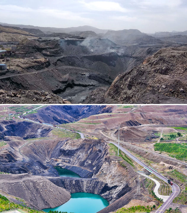 拚版照片,上圖為(wei) :位於(yu) 寧夏石嘴山市的賀蘭(lan) 山石炭井礦區(2017年5月30日攝,新華社發);下圖為(wei) :2024年8月6日拍攝的修複治理後的賀蘭(lan) 山石炭井礦區(無人機照片,新華社記者馮(feng) 開華攝)。