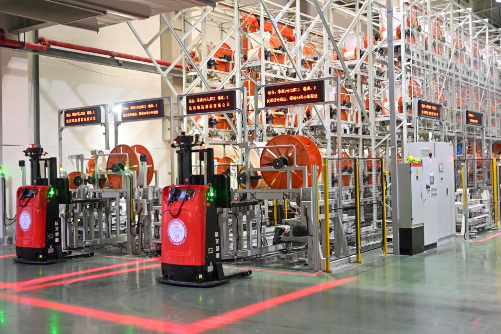 7月26日,無人叉車在杭州中策錢塘實業(ye) 有限公司輪胎數字工廠車間內(nei) 裝運物料。新華社記者 江漢 攝