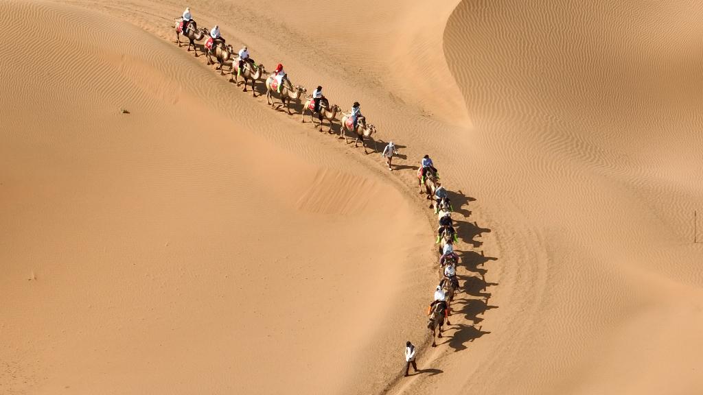 7月26日,遊客在寧夏中衛市沙坡頭景區體(ti) 驗騎駱駝。新華社記者 呂帥 攝