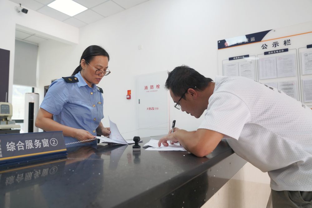 南寧國際鐵路港貨運營業(ye) 廳工作人員指導客戶辦理業(ye) 務。(國鐵南寧局供圖)