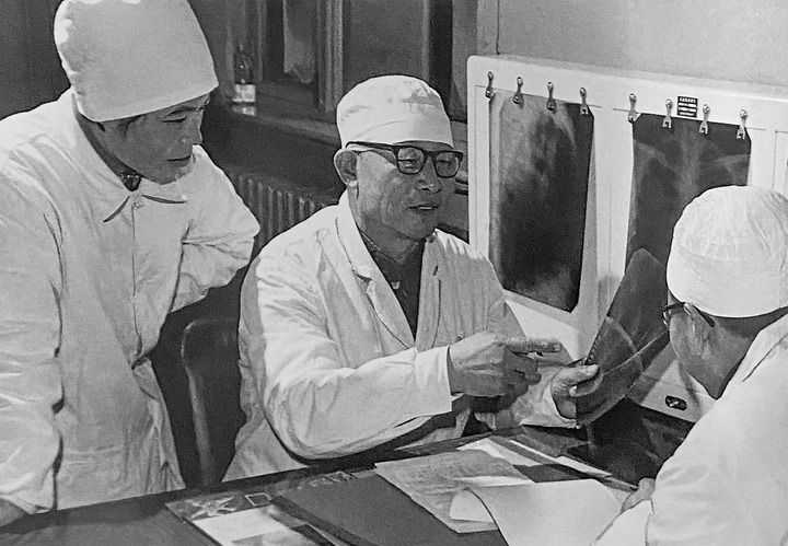 1980年1月16日,中日友好醫院首任院長辛育齡(中)在內(nei) 蒙古結核病院與(yu) 胸外科醫師討論病例(翻拍照片)。 新華社發