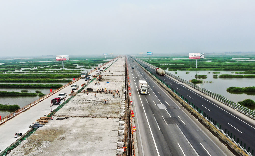 2024年7月4日,在京哈高速公路遼寧段改擴建工程項目施工現場,中鐵四局建設者進行橋麵施工作業(ye) (無人機照片)。新華社記者 楊青 攝