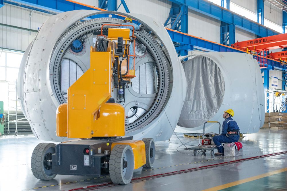 2024年4月28日,工人在位於(yu) 黑龍江省齊齊哈爾市的中國一重集團有限公司風電設備裝配車間加工風電輪轂。新華社記者 謝劍飛 攝