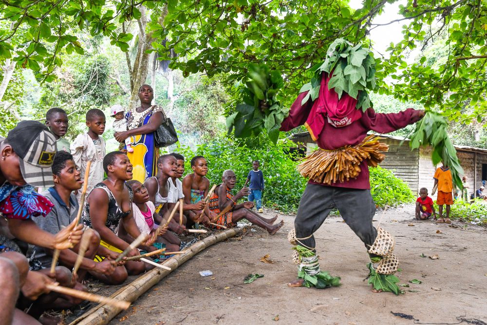 7月11日,在喀麥隆南部大區克裏比市,恩杜馬萊村的俾格米人村民舉(ju) 行慶祝活動。新華社發(科普索攝)