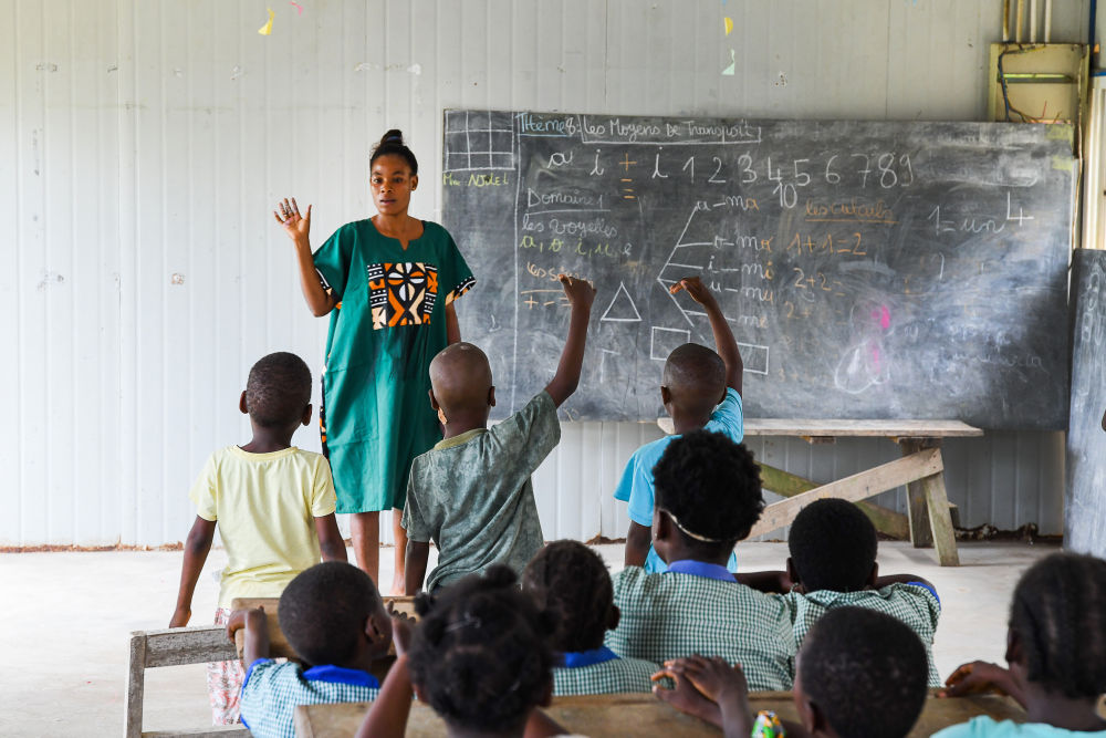 7月10日,在喀麥隆南部大區克裏比市,老師和學生參加恩杜馬萊雙語學校暑期活動。新華社發(科普索攝)