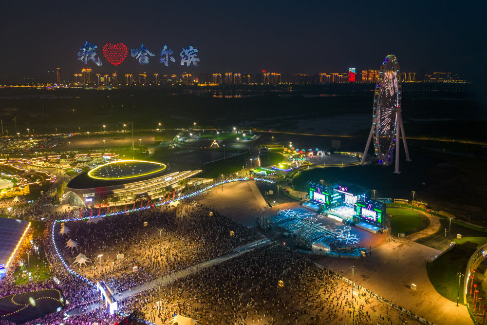 人們(men) 在哈爾濱國際啤酒節現場觀看無人機表演。新華社記者 張濤 攝