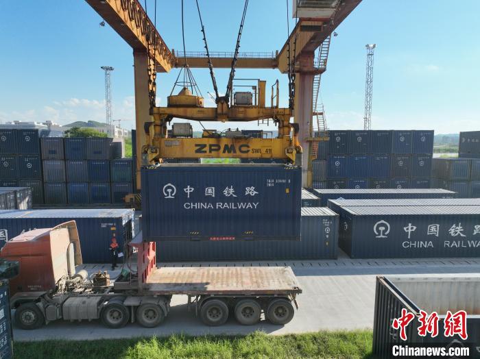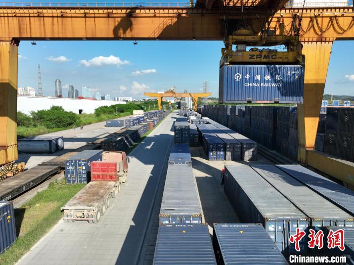 8月26日,廣西南寧國際鐵路港內(nei) ,鐵路職工頂著下午的烈日,正在為(wei) 發往越南的貨運班列裝卸貨物。該鐵路港是廣西始發中越班列的核心場站。國鐵南寧局提供的信息顯示,今年前7個(ge) 月,廣西始發中越班列累計發運貨物6850標箱,同比增長16倍;其中7月份發運1922標箱,超過今年一季度發運量總和,為(wei) 今年以來第三次刷新單月發運量紀錄。圖為(wei) 集裝箱擺滿場站,等待裝車。王以照 攝