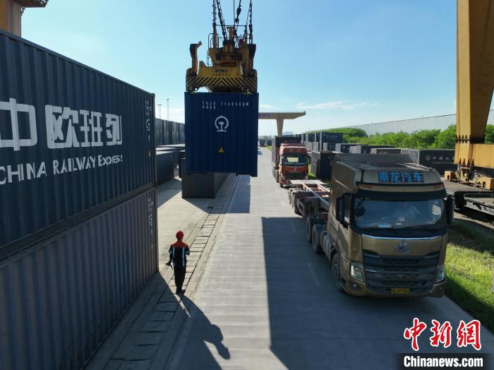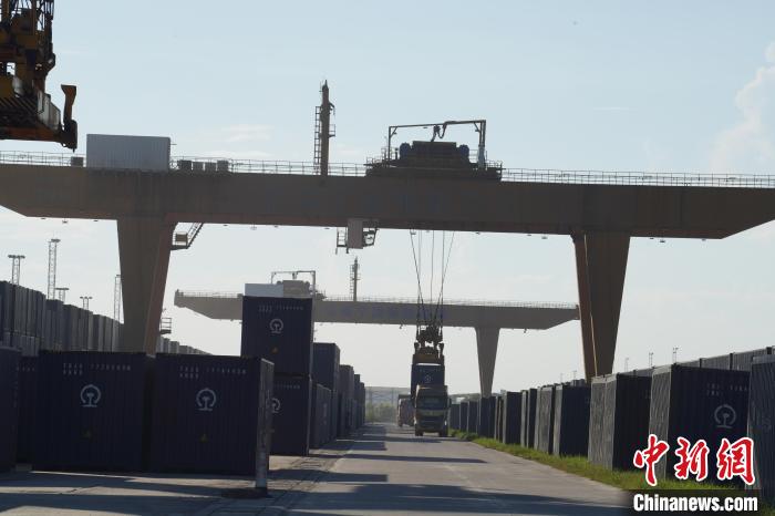 圖為(wei) 龍門吊正將集裝箱從(cong) 卡車轉移至中越班列。王以照 攝