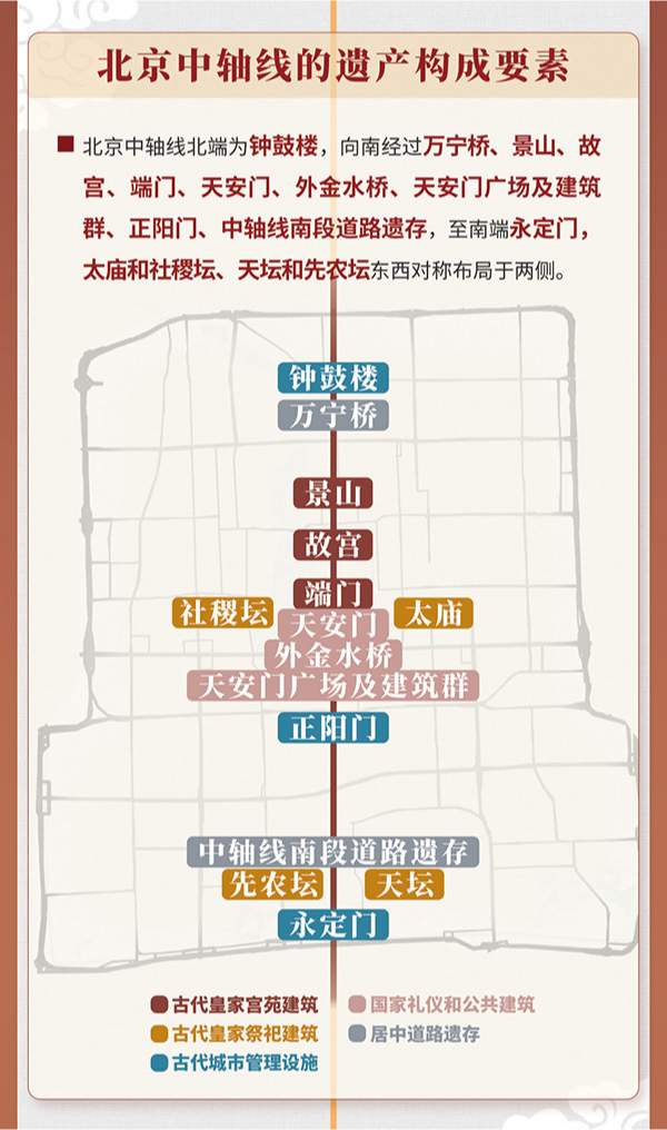 北京中軸線始建於(yu) 元,成型、豐(feng) 富於(yu) 明清,發展、傳(chuan) 承於(yu) 近現代,是逾7個(ge) 世紀城市曆史遺存不斷累積疊壓的結果,成為(wei) 北京老城獨特景觀秩序的極致體(ti) 現。元至元四年(1267年)至明永樂(le) 三年(1405年),初步確立了北京中軸線的位置與(yu) 基本形態。明永樂(le) 四年(1406年)至明嘉靖四十三年(1564年),北京城形成“凸”字形城郭格局,北京中軸線的整體(ti) 格局基本形成。現存古代皇家宮苑、祭祀建築和城市管理設施均始建於(yu) 這一時期。明嘉靖四十四年(1565年)至1911年,北京中軸線的整體(ti) 格局得以保持和延續,清乾隆年間對北京城規劃格局的調整與(yu) 完善,進一步豐(feng) 富與(yu) 加強了中軸線的景觀秩序。1912年以後,原有服務於(yu) 皇權的儀(yi) 式性空間轉變為(wei) 服務公眾(zhong) 的開放空間。中華人民共和國成立後,天安門廣場的規劃與(yu) 建設延續並強化了中軸線居中、對稱的規劃格局,北京中軸線作為(wei) 北京城市發展的基準線仍然發揮著統領性作用。