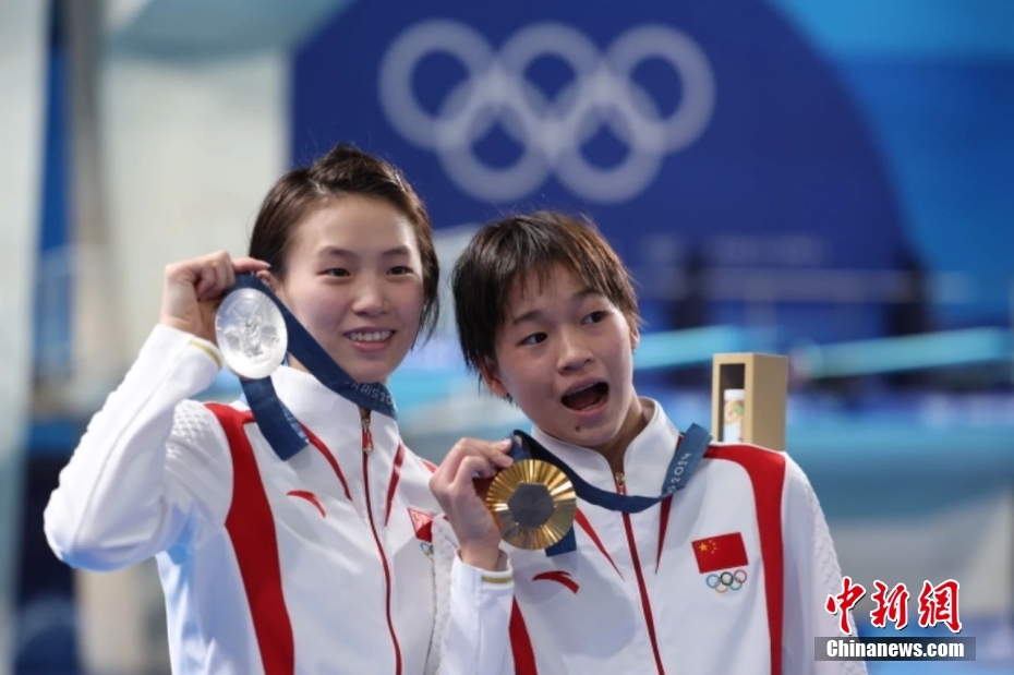 圖為(wei) 陳芋汐(左)、全紅嬋(右)展示獎牌。中新社記者 富田 攝